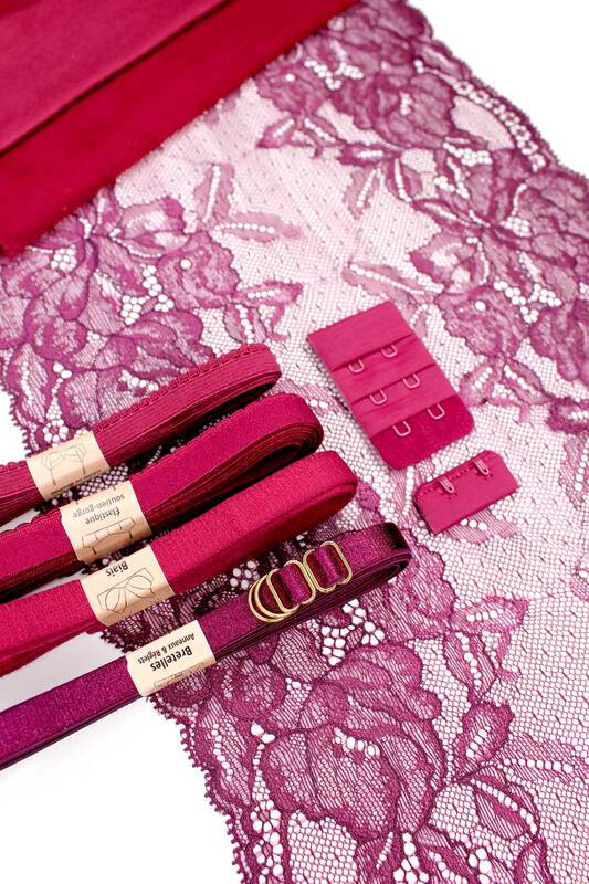 Chaque kit contient les matières et fournitures adaptées pour coudre au minimum une parure de lingerie, c'est-à-dire un soutien-gorge ou une brassière et un bas du corps, soit :