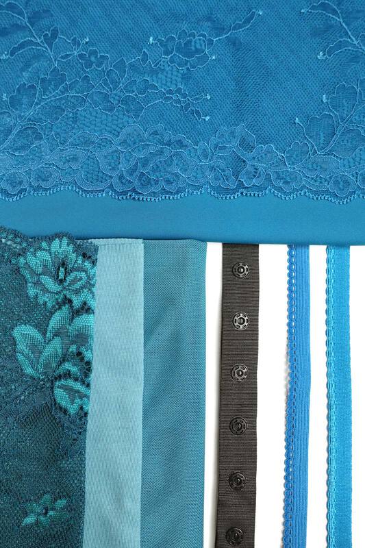 | · Deux fois 2,5m dedentelles élastiques · 1,40m de microfibre turquoise extensible dans les deux sens · Un coupon de jersey 100% coton pour l'entrejambe · 2m d'élastique culotte de 0,7cm de large pour les cuisses · 2m d'élastique sous-poitrine 1cm de large pour la brassière intégrée · 20cm de bande boutons pressions pour l'entrejambe · 1 coupon de tulle extensible supplémentaire, que tu peux utiliser pour utiliser pour coudre une brassière intégrée supplémentaire. |