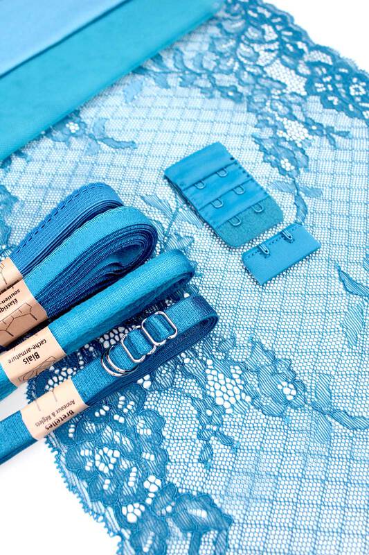 Chaque kit contient les matières et fournitures adaptées pour coudre au minimum une parure de lingerie, c'est-à-dire un soutien-gorge ou une brassière et un bas du corps, soit :