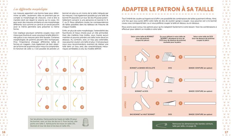 C'est pourquoi nous avons pris le soin de développer nos patrons de la taille XS à 3XL (équivalent aux tailles 32/34 à 52 pour les bas, et 80A à 110G pour les soutiens-gorge).